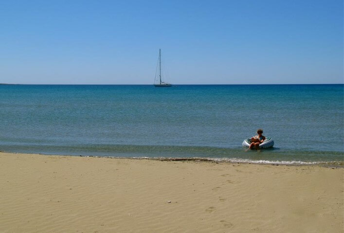 Αβαθής παραλία με χρυσή αμμουδιά και καταγάλανα νερά, απάνεμη και οργανωμένη αποτελεί ιδανικό οικογενειακό προορισμό.