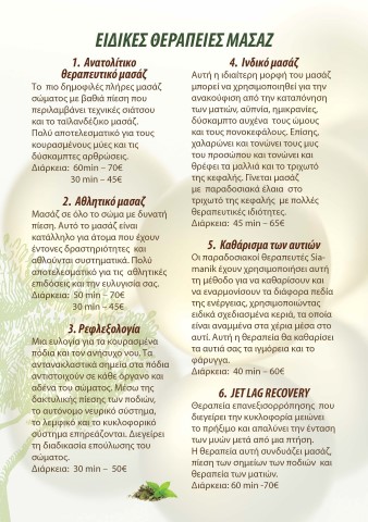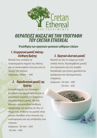 Массаж – это альтернативная форма лечения и релаксации организма. Традиционный критский расслабляющий массаж всего тела и терапевтический массаж спины являются характерными терапиями, основанными на натуральных ингридиентах.